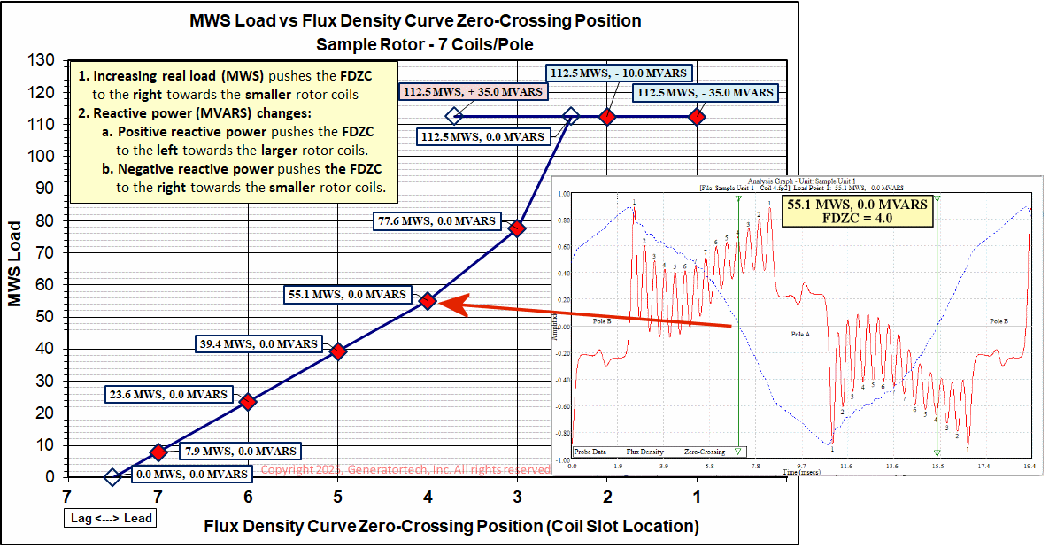 A given load in a synchronous generator produces a waveform with a flux density zero-crossing (FDZC) position that falls within the leading coil slots on the rotor. The MWS Load vs FDZC Position Graph in Figure 1 shows how both real and reactive load changes affect the FDZC position in a unit with a 7 Coils/Pole rotor. Higher real loads (MWS) push the FDZC position to the right towards the smaller rotor coils (Coils 1 and 2). At a given real load (MWS), reducing positive reactive power (MVARS) or increasing negative reactive power will also also push the FDZC position to the right.