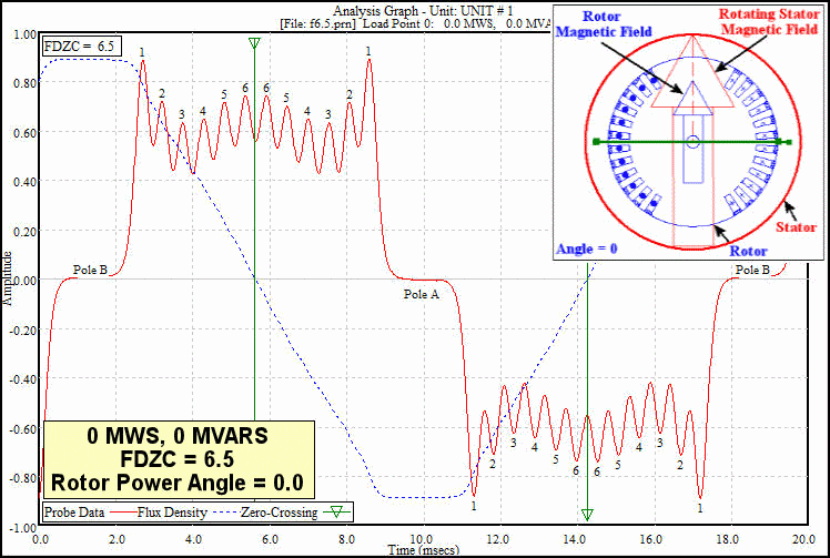 The animations below show a test in a rotor with 6 coils/pole and a short in Coil 5-Pole A (Coil 5A). The seven waveforms were recorded during a startup that reached full load. The FDZC position moves to the right as the load changes from no-load to full-load The FDZC position is determined by the Rotor Power Angle, which is the angular separation between the north pole of the rotor and the north pole of the rotating stator field. The rotor power angle changes with both input torque changes (Real Power changes) and the rotor magnetic field strength (determined by Field Current, which can be altered through Reactive Power changes).