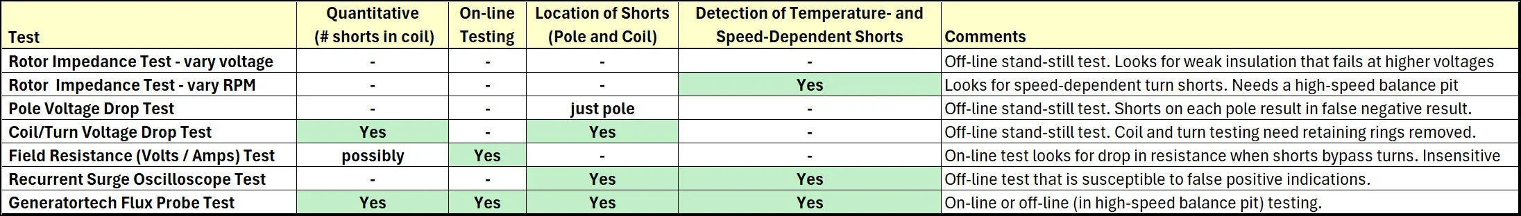 A number of standstill tests are used to check the rotor winding condition during outages and rewinds. Each has their strengths and weaknesses. The table below displays a comparison of different rotor winding tests.