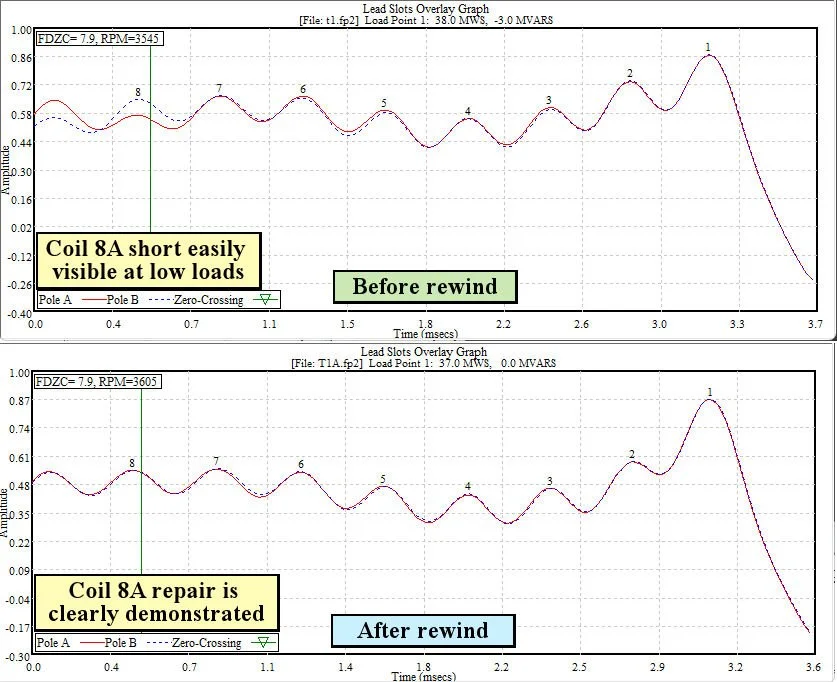 The images below show a large 680 MVA generator with 8 coils/pole and 5 turns in Coil 1 and 6 turns in Coils 2-8. A turn short in Coil 8A was not clearly detectable at full load, but was obvious at low loads. The rotor was rewound and the Coil 8A short was repaired, however, full load data could not confirm the repair. Low load data was needed to see that the rewind was successful.
