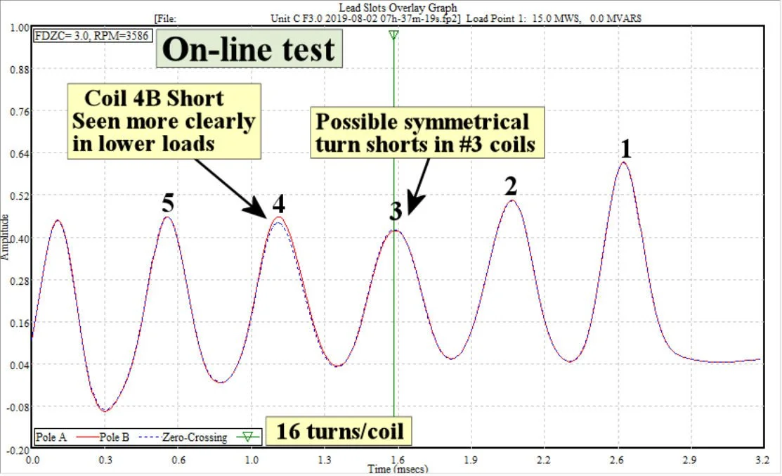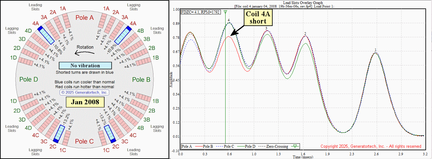 The Lead Slots Overlay Graph animation shows a complete test from 2008 when the rotor had two shorts. The Coil 4A short was easily detectable at lower loads, but was not detectable near full load. Full load waveforms after the rotor developed the Coil 1A short and after a rotor rewind are also included.