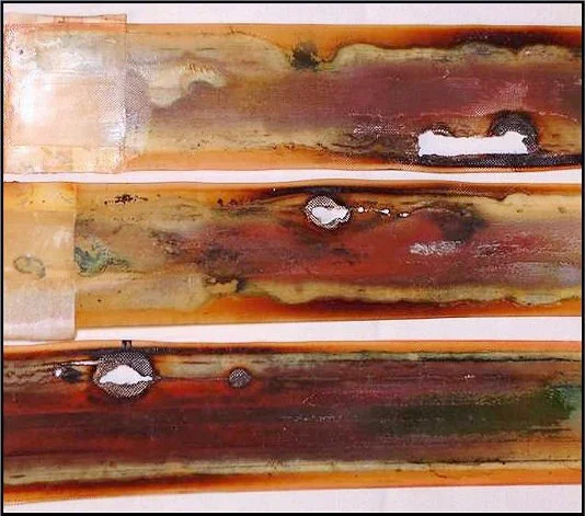 Three separate strips of inter-turn insulation showing holes that resulted in turn shorts.