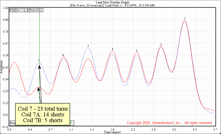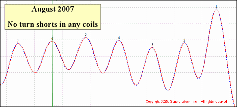 A large jump in vibration was investigated with a flux probe test, which clearly showed a coil-to-coil short between Coils 3A and 4A. The contact was unusual in that it was between the bottom turns of the two coils and it bypassed 20 total turns in the winding.