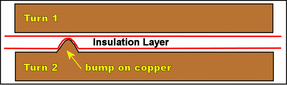 When turn-to-turn movement occurs, tremendous shear forces are created on the thin insulation layer, This can create tears or displace insulation producing a shorted turn contact.