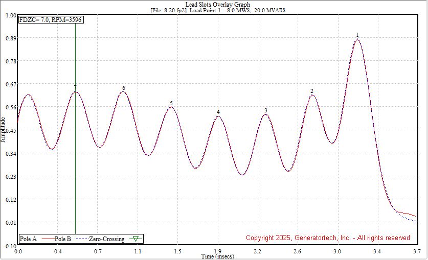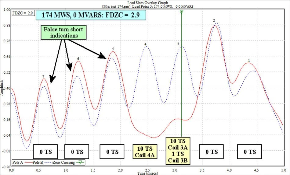 Overspeed events have been shown to cause turn shorts. The animation below shows a large 800 MVA rotor than had been tested free of shorts. Six months later, a major grid disturbance led to a 3960-RPM overspeed event (synchronous speed is 3600-RPM). The elevated centrifugal forces on the turns evidently created a new turn short in Coil 6B (only the loads with the best Coils 6 detection sensitivity are shown).
